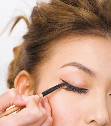 01 先用液体眼线液紧贴着睫毛的位置画出略粗的眼线