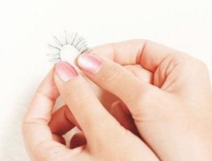 用手指肚捏住睫毛的两端,向中间轻轻弯曲,弯曲几次后,假睫毛的连接梗会变得柔软,这样就更容易粘贴。