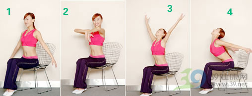 该组动作的目的:拉伸颈、胸、肩部肌肉,锻炼背部和手臂,同时有助于放松端坐一上午而僵化的肩颈部。
