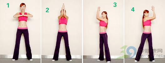 Step1:双手合十,并掌,向胸部用力,双脚打开比肩略宽,调整呼吸,并保持收腹挺胸。