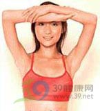 step2:双臂提高至膊头位置,两只手互相推动。一边推动,一边提高至头部后,再返回膊头位置,来回5次交换手臂的位置再做,重做20次。
