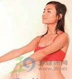step4:双臂向后伸,大幅度打开,缓缓地吐气,同时胸部向前挺。