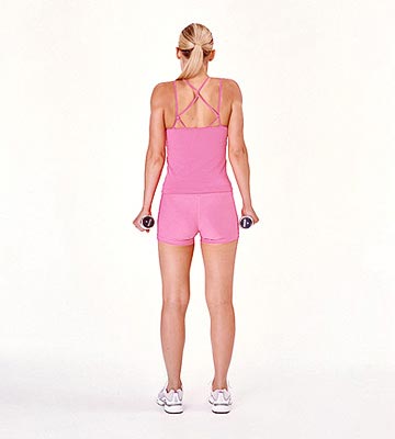 双脚分开与髋部同宽,双手放在身体两侧,膝盖微曲。双手各持一只大约2.5公斤的哑铃,掌心向内。保持腰腹用力,慢慢耸肩,注意手臂不能弯曲,数3下,然后让肩膀恢复原位。重复以上动作,做8到10次。
