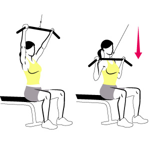 坐在一个高拉力训练器械上,双手分开与肩部同宽,握住拉力器,手臂伸直,腰背挺直。保持上身不动,依靠肩膀的力量拉动拉力器,到达极限时稍作停顿,然后恢复原状。做三组,每组12次。