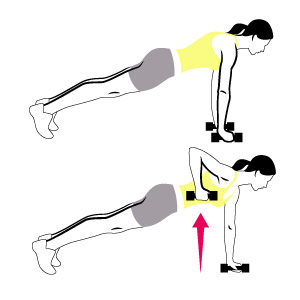 双手各握一只哑铃,做出俯卧撑的起始动作,双脚分开达到大约臀部的宽度。腰部挺直,用力倾向于一侧肋部,另一侧的手将哑铃提起,稍作停顿,放下,换另一只手。做三组,每组12个。