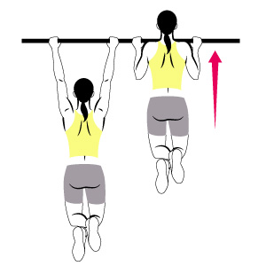 站在单杠前,掌心向前握横杆,小腿向后抬起,在身体后交叉。肩膀用力,将身体牵引向上,最理想是达到胸部接触到横杆的高度,然后慢慢放下。做三组,每组12个。