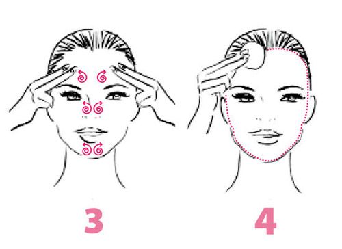 打湿脸庞,将洁面产品在手上打出泡沫后在法令线部位、脸颊和下巴以图上所示的画圈方式轻揉,注意打圈时要以向外的方向带走油污。