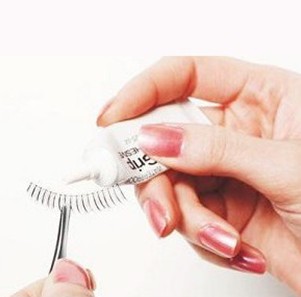 涂抹黏合剂之前要先测量一下眼睛的长度,如果太长的话需要修剪假睫毛。睫毛连接梗很细,在涂抹黏合剂时用镊子夹住假睫毛仔细涂抹,注意涂得要细要均匀。