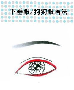 下垂眼需要将原本正常上翘的眼尾弧度变得平缓,因此需要从下眼睑1/2处开始向眼尾画出逐渐加粗的下眼线,眼尾与上眼线以圆润的线条过渡融合,即可打造出眼角垂坠感十足的狗狗眼了。适合眼型:较圆眼型。适合脸型:圆脸型、椭圆脸型。