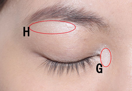 Step 1:先用附带的小号毛刷沾取G色打亮内眼角与下眼头。用量要少,再用较大的一支取H色提亮眉骨。刷毛比较柔软,长杆也便于操作。