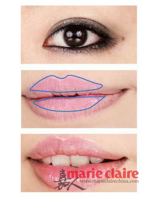 嘴唇涂什么颜色都可以,先将唇膏涂在这范围内。若涂到下唇底部唇线为止,嘴唇会显得下垂,随之脸部整体也会下垂拉长,所以我只涂上面的部分就可以了。最后涂上透明唇蜜!