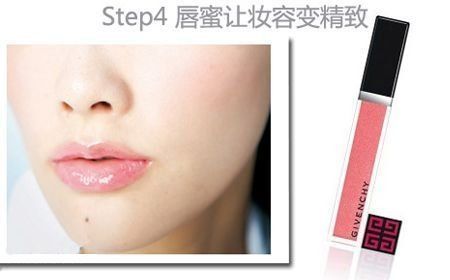 步骤分析:先使用唇部遮瑕膏对双唇进行饰色,遮盖了原有的唇色后,选择裸色的唇蜜,涂抹在双唇的中心并晕开。
