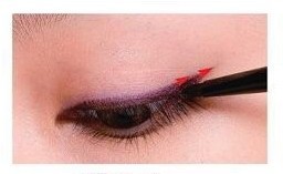 Step3.使用眼线刷沾取紫色眼线胶(也可用眼线液代替),从眼头沿着睫毛根处描绘出上眼线,长度要超过最后一根睫毛。