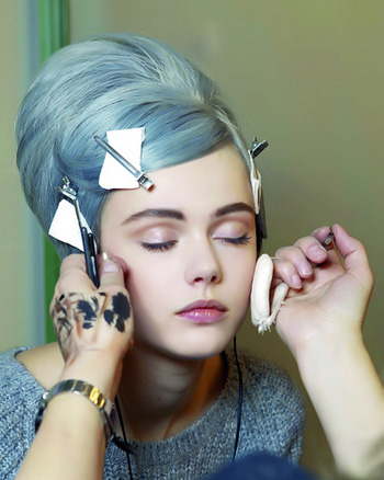 先用吸油纸将油光除去,然后将高光粉刷在T字区,用提亮的方式,依靠光线制造出视觉上的明亮感,将脸部妆容的焦点集中在这两个区域,打造出神采奕奕的感觉。主要是用刷子蘸取高光粉,在额头、眉头、鼻梁的T字区轻轻刷上一层即可。