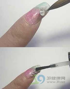 最后表面在铺上透明水晶粉,让整个甲面的色块接痕更平顺。