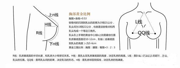 其中,半球形是国际公认的最美胸型。所谓半球型就是在不穿胸罩的情况下,乳头的高度在上臂中点的水平线;从胸骨柄上切迹中点到两侧乳头的距离与双乳头间距形成等边三角形,乳形为半球状,富有弹性。乳头挺立,乳头乳晕成淡粉红色。上胸围与身高的黄金比值为0.53(相当于穿B罩杯胸衣的乳房)。当然更性感和理想的乳房最好在上胸围与身高之比在0.53~0.55之间(相当于穿C罩杯胸衣的乳房)。