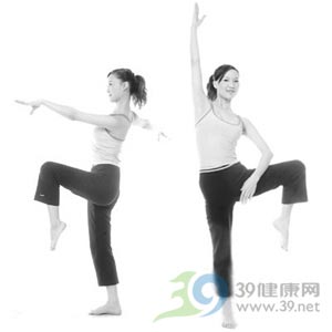 2.用腹部呼吸的力量将整个身体往上提,踮起左脚脚尖,保持3秒钟后用5秒钟慢慢吐气复原,重复5次后...