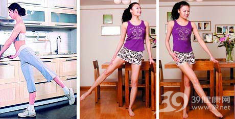 利用平坦的沙发侧面,腰部以上保持直立,以单一脚板顶住沙发,双脚之间的距离约与肩同宽,然后屈膝做上下摆动的姿势,摆动的幅度约为90度效果最佳。双脚轮流交替,重复同样动作各约20次。