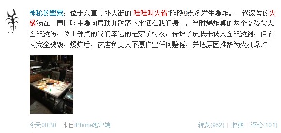 @神秘的罂粟:位于东直门外大街的“哇哇叫火锅”昨晚9点多发生爆炸。一锅滚烫的火锅汤在一声巨响中爆向房顶并散落下来洒在我们身上,当时爆炸桌的两个女孩被大面积烫伤,位于邻桌的我们幸运的是穿了衬衣,保护了皮肤未被大面积烫到,但衣物完全被毁,爆炸后,该店负责人不愿作出任何赔偿,并把原因推辞为火机爆炸!