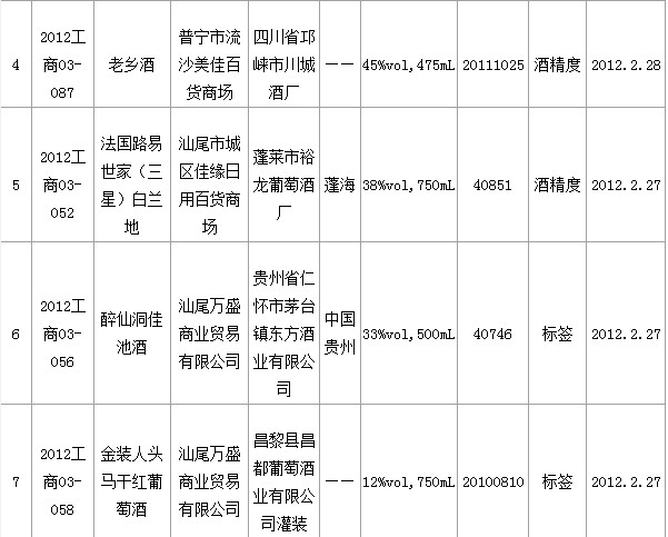 本次酒类抽检地区为潮州市、揭阳市、汕头市和汕尾市,共抽检白酒、葡萄酒、黄酒、啤酒、白兰地和威士忌等酒类100批次,合格91批次,不合格9批次,合格率为91%,纯标签不合格4批次,内在质量合格率为95%。不合格酒类主要表现在酒精度不合格,并发现有一批次葡萄酒山梨酸含量超标。