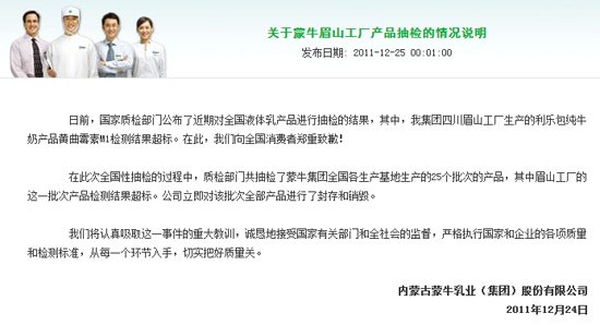 内蒙古蒙牛乳业(集团)股份有限公司25日在其官方网站上就此事件发出声明。声明中称,对此次事件,“向全国消费者郑重致歉”。声明中还表示,在此次全国性抽检的过程中,质检部门共抽检了蒙牛集团全国各生产基地生产的25个批次的产品,其中眉山工厂的这一批次产品检测结果超标。公司立即对该批次全部产品进行了封存和销毁。