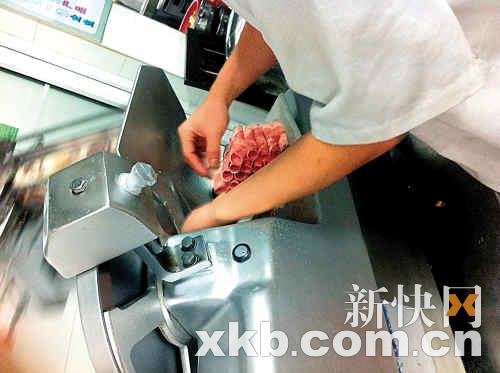 厨房师傅直接用手从刨肉机里抓取羊肉。