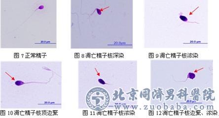 2.1. 精子头部凋亡形态: 精子正常形态(图7),凋亡精子头核深染(图8),凋亡精子头核浓缩、深染(图9、11),凋亡精子头核顶边聚、浓染(图10、12),凋亡精子头核中聚(图13),凋亡精子头核边聚(图14),圆头凋亡精子(图15),双头凋亡精子(图16)小头凋亡精子(图17),大头凋亡精子头核顶边聚(图18)。