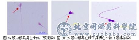 2.4.1颈中段凋亡精子具凋亡小体:颈中段凋亡精子具凋亡小体颈部非浓染(图37)和颈部浓染(38、39)的形态。
