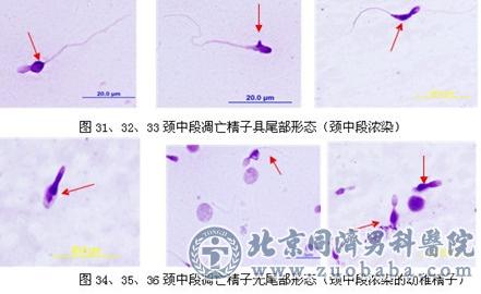2.4颈中段凋亡精子: 颈中段凋亡精子有两种类型,一种可以看到尾部者(图31、32、33);一种看不到尾部者(34、35、36),核均呈现浓缩、浓染的凋亡状态。