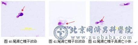 3. 尾部凋亡精子:可以看到浓染(图40)与淡染形态(图41),尾凋亡也可以看到凋亡小体(图42)。这一类精子都属于幼稚精子表现的不同凋亡形态。