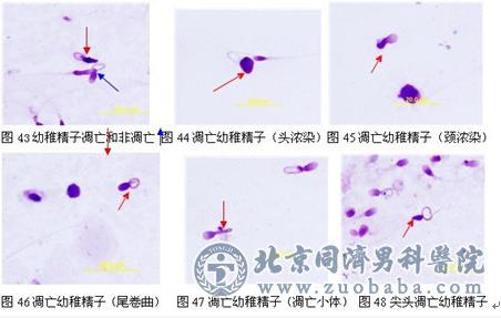 4.幼稚凋亡精子 幼稚精子可有凋亡和非凋亡的区分(图43),在凋亡的幼稚精子中又可以看到头部浓染的凋亡幼稚精子(图44),也可以看到残体部位浓染的凋亡幼稚精子(图45),尾卷曲的幼稚凋亡精子(图46),幼稚凋亡精子残体部位具凋亡小体(图47),尖头凋亡幼稚精子(图48)。