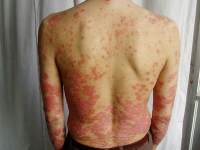 银屑病,俗称牛皮癣,其特征是出现大小不等的丘疹,红斑,表面覆盖着银白色鳞屑,边界清楚,好发于头皮、四肢伸侧及背部。男性多于女性。春冬季节容易复发或加重,而夏秋季多缓解。