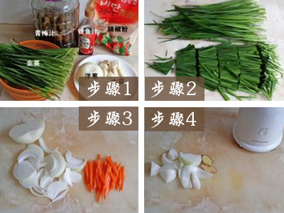 6.切好的韭菜,洋葱,胡萝卜丝放在一起和做好的汁一起搅拌。