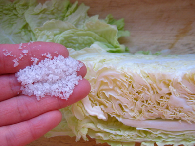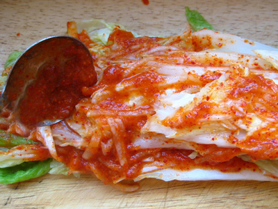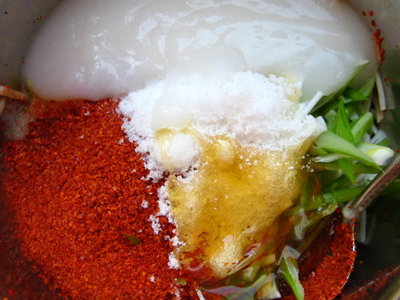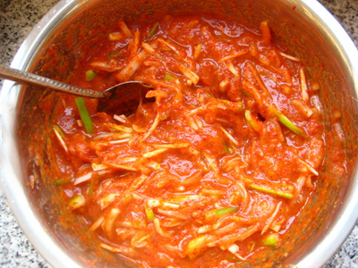 主料:大白菜1棵(约2.5千克)、白萝卜半根(约400克)、葱1根、香芹1把、调料蜂蜜2大勺、糯米糊1杯、盐250克、水10杯(混合)、白糖2大勺、鱼露60毫升、韩国虾酱2大勺、姜泥1大勺、蒜泥2大勺、梨泥3大勺、辣椒粉8大勺、苹果泥3大勺