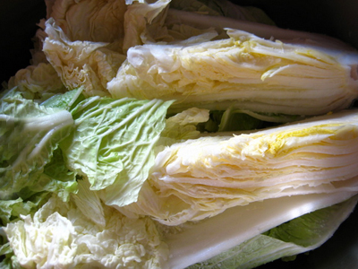 2、再将白菜放入A料中略压待软化,约8小时取出,用凉开水略微清洗,沥干水分。