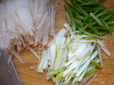 3、白萝卜去皮切丝,葱、芹菜切小段备用。