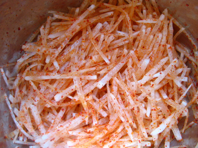 4、白萝卜丝用少许盐和辣椒粉拌均。