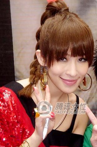 萧亚轩的这款大麻花辫子好似一大串鞭炮一样,十足的打眼!淑女感的齐刘海搭配高高扎起的简洁单辫,凸显美丽的下巴和颈部曲线,特别适合小脸MM,让你顿时神采奕奕。搭配金色大耳环、BlingBling亮片装饰的红色服装,增加更多喜气。