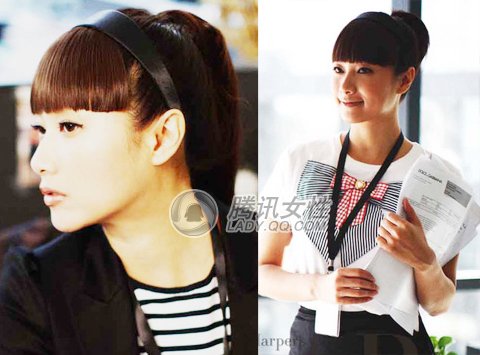 “杜拉拉”式OL们的初夏好选择——由徐静蕾为商务女性们示范的这款齐刘海马尾发型,加上低调深色发箍的装饰,清爽简洁中透出干练知性,同时又不会让穿着通勤装的OL太闲死板老气。