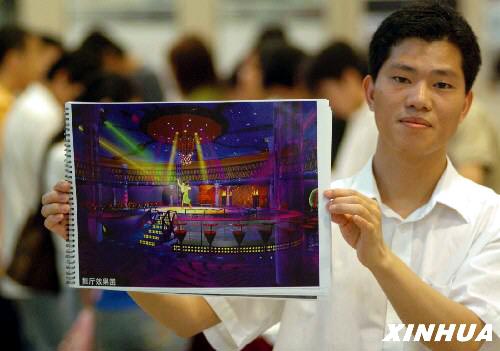 南宁职业技术学院艺术工程系学生黄永鹏在展示他的设计作品。 5月10日,在南宁市广西展览馆,用人单位代表在观看南宁职业技术学院艺术工程系毕业生的设计作品。5月9日至10日,南宁职业技术学院艺术工程系在南宁市广...