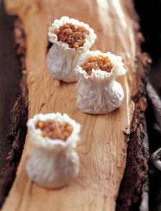 3.将高筋粉加入100克温水揉成面团,然后搓成条,擀成烧麦皮(或用馄饨皮代替),将馅包入皮中成荷花形,上笼蒸10分钟即可。