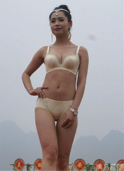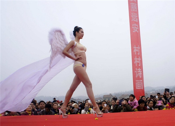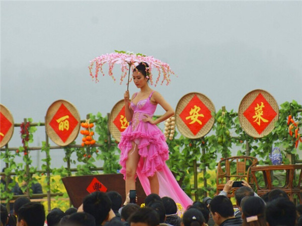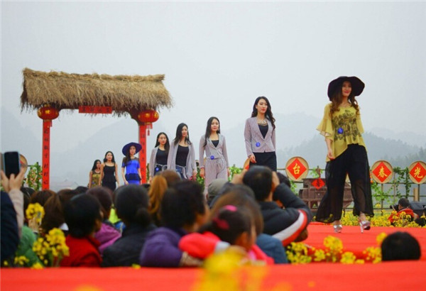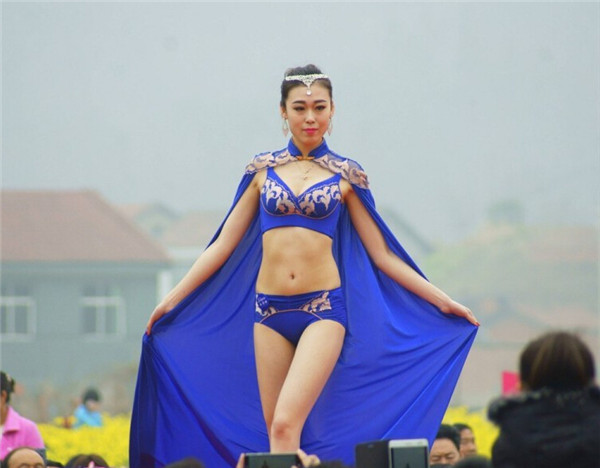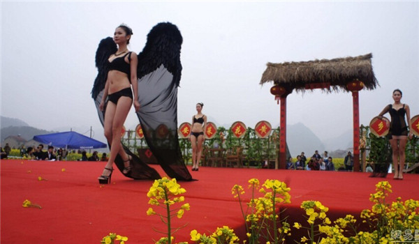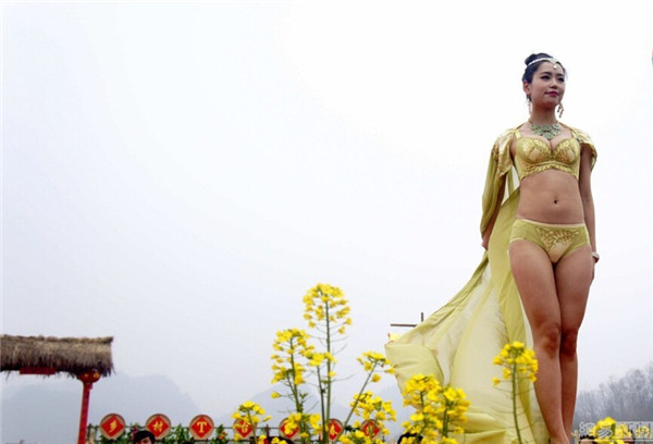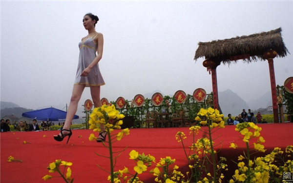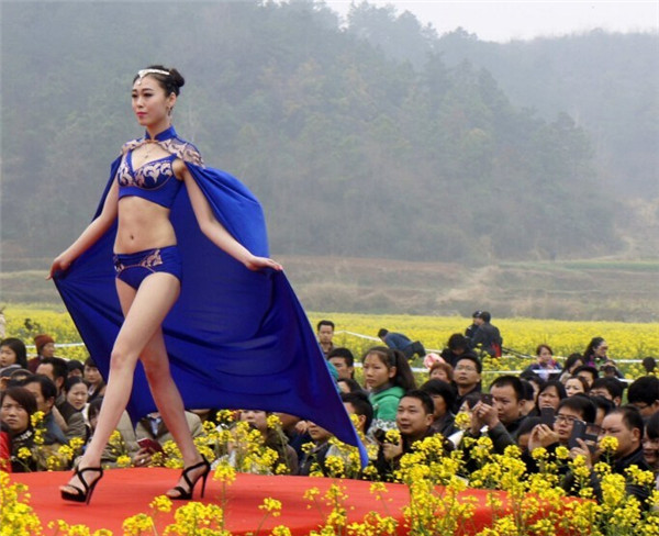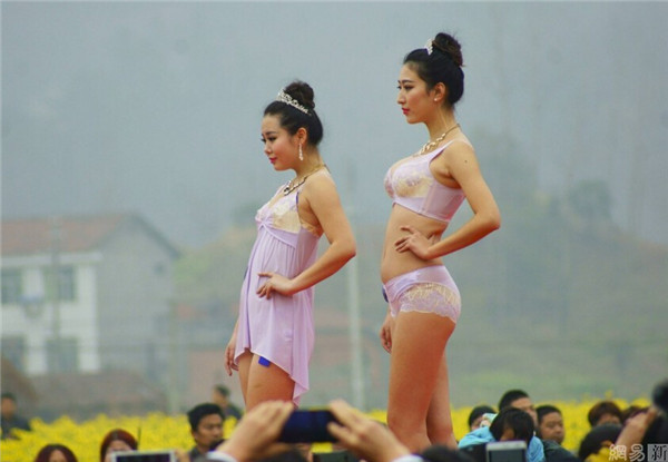 2015年3月14日,湖北宜昌举办第二届美丽远安油菜花节,女模特穿着清凉,上演了一场乡村T台服装秀,吸引众多市民和摄影爱好者围观拍照。图为2015年3月14日,湖北宜昌,油菜花节上演乡村T台服装秀。