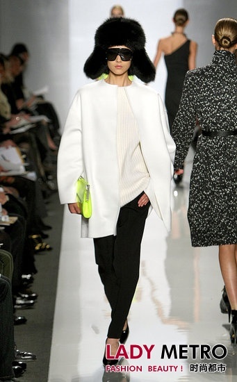 端平的肩线是这个秋冬michael kors秀场上反复出现的元素,于是拿上一个荧光色手包,穿上一件白色粗呢大衣和一条窄腿黑裤,像不像从70年代电影中走出的办公室女郎。