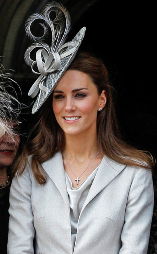 凯特王妃头戴一顶搭配了卷曲羽毛以及丝绸带子的灰色礼帽亮相。