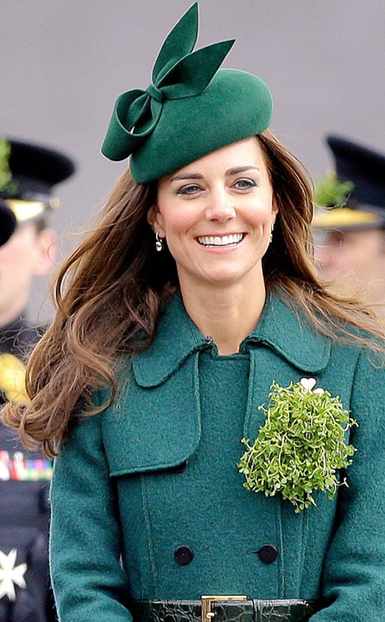 凯特王妃的全绿色穿搭备忘录,Gina Foster翡翠绿帽子搭配水绿色大衣,以及一枚三叶草做的胸针。