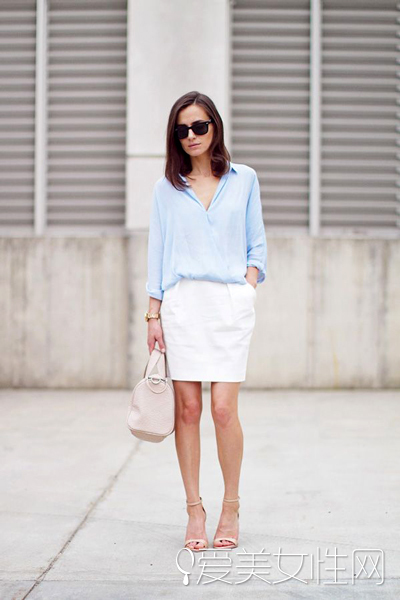 【搭配示范】:蓝色衬衫+白色半裙+细带高跟鞋+手提包