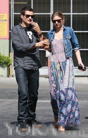 miranda kerr,牛仔搭配雪纺长裙也是经典组合。