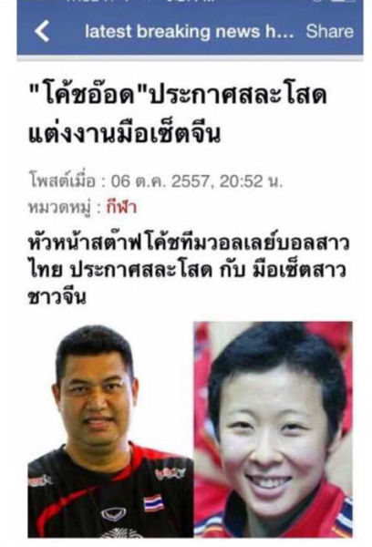 2014年10月7日消息,名为“Thailand Volleyball”(泰国排球网)的脸书账号爆料,前中国女排队长冯坤将与泰国女排现任主教练加提蓬结婚,婚期暂定在了今年12月。这一消息的发布也引起了泰国主流媒体的注意,因为“Thailand Volleyball”长期关注泰国排球动态,经常被排球圈媒体视为相对权威可靠的消息源。