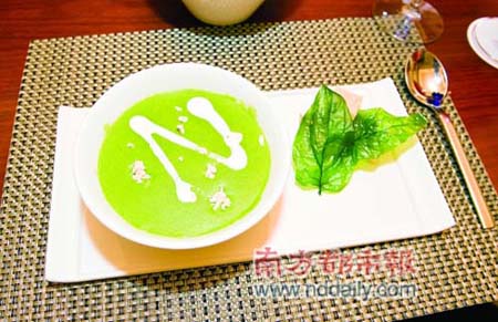 这道西式浓汤有着类似于土豆泥的味道。卢师傅称,土豆泥很容易让人产生饱腹感,这道大蒜薯蓉汤却不会,让食客品尝到土豆、忌廉的香浓细滑,同时也留足了食量去品尝其他美味佳肴。炮制甚为讲究,将带皮的生土豆烤至焦香,去皮后打成蓉,然后加水熬煮,加孖茨粉增加汤浓度,提升薯仔味,最为关键的调料忌廉也是很讲究,一定要淡忌廉,这样熬出来的汤口感更细滑。接着就要耐心地熬煮一个多钟头,如此高淀粉的食物,居然品尝不到一丝颗粒感。
