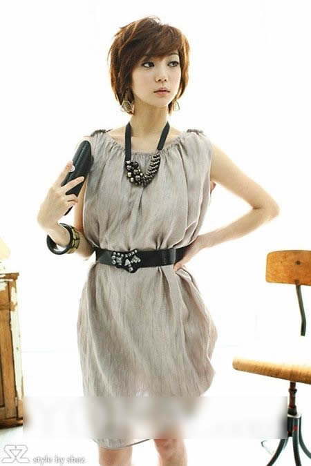 灰色褶皱连衣裙,搭上有设计感的腰带,带上夸张的项链,拿起手包去参加party。
